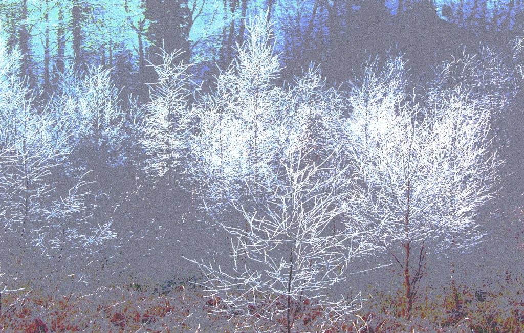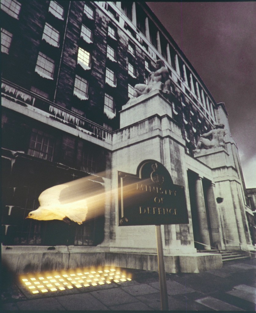 From early days I had been experimenting in the darkroom with sepia and blue toners in my photography. These techniques are exemplified below in the images of Westminster Abbey and the Ministry of Defence and ranging from simple back-lit pin holes on Dyfnant Forest, to a weeks worth of multi-image collage for Greenham Common; this was long before the days of photoshop.